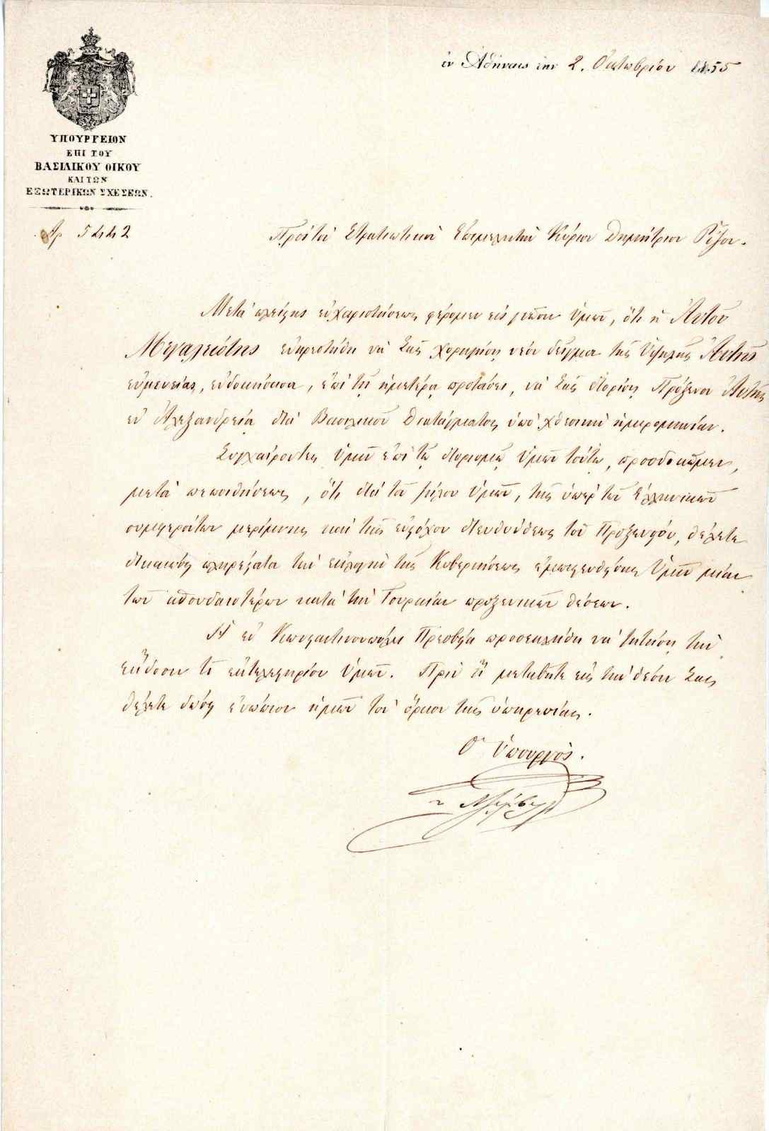 Σήμερα, για πρώτη φορά, το ιστορικό αυτό έγγραφο αναδύεται στο φως, ανοίγοντας ένα νέο κεφάλαιο στην κατανόηση των ελληνοοθωμανικών σχέσεων και της διπλωματικής ιστορίας του 19ου αιώνα. «Είναι ένα επίσημο αυτοκρατορικό φιρμάνι, υπογεγραμμένο το 1855 από τον σουλτάνο Αμπντούλ Μετζίτ Α' , που ορίζει τον Δημήτρη Ρίζο Νερουλό ως πρόξενο της Ελλάδας στην Αλεξάνδρεια της Αιγύπτου, αντικαθιστώντας τον Μιχαήλ Τοσίτσα», εξηγεί στο Αθηναϊκό/Μακεδονικό Πρακτορείο Ειδήσεων ο άνθρωπος που ανέλαβε τη μετάφρασή του από τα οθωμανικά, ο ιστορικός ερευνητής Γιώργος Μπατζακίδης.
