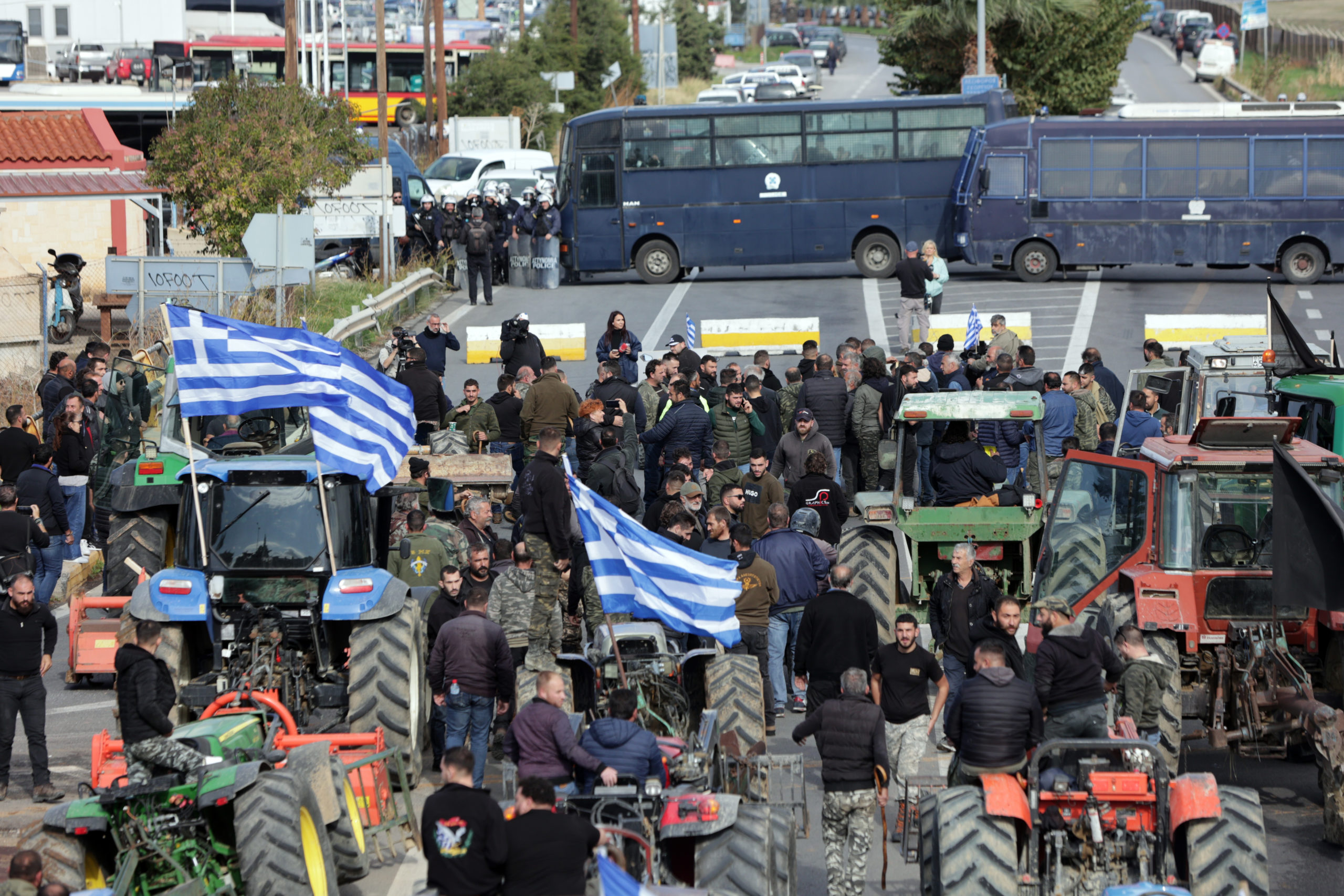 Στις εικόνες που μεταδόθηκαν από την ΕΡΤ, καταγράφηκαν αγρότες να σπάνε με τις κατσούνες τους ένα όχημα της αστυνομίας, το οποίο και αναποδογύρισαν. Άλλοι πέταξαν πέτρες στις κλούβες της αστυνομίας, που έχουν στήσει τον φραγμό.