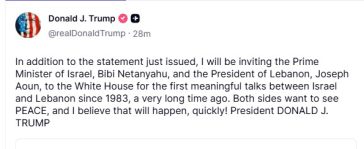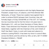 «Μόλις είχα πολύ καλές συνομιλίες με τον ιδιαίτερα σεβαστό Πρόεδρο του Λιβάνου, Joseph Aoun, και τον Πρωθυπουργό του Ισραήλ, Μπέντζαμιν Νετανιάχου. Οι δύο ηγέτες συμφώνησαν ότι, για να υπάρξει ειρήνη ανάμεσα στις χώρες τους, θα ξεκινήσουν επίσημα μια εκεχειρία διάρκειας 10 ημερών, που θα αρχίσει στις 5 το απόγευμα (ώρα Ανατολικών ΗΠΑ).